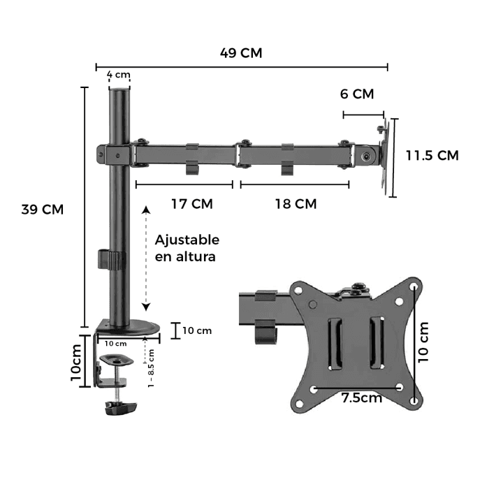 Maximiza la comodidad y funcionalidad de tu espacio de trabajo con el soporte articulado para monitor S-1. Fabricado en metal resistente con pintura electrostática, garantiza durabilidad y un acabado profesional. Su diseño ajustable ofrece total versatilidad, permitiendo una mejor postura y mayor comodidad en uso prolongado.